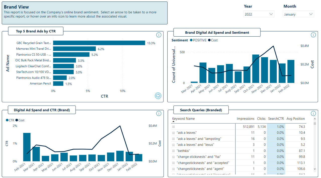 - Demonstrate the use of filters, categories, drill-throughs, and tooltips within the dashboard views, enabling users to identify performance, sentiments, and data benchmarks