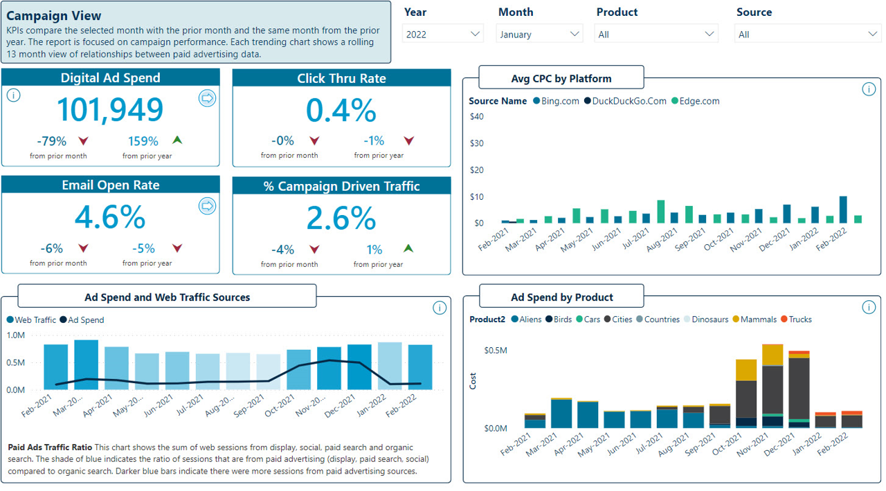 To provide the marketing team and executive leadership with the ability to analyze campaign performance in aggregate and to drill down to the individual campaign, product, and audience levels, we implemented the following approach: